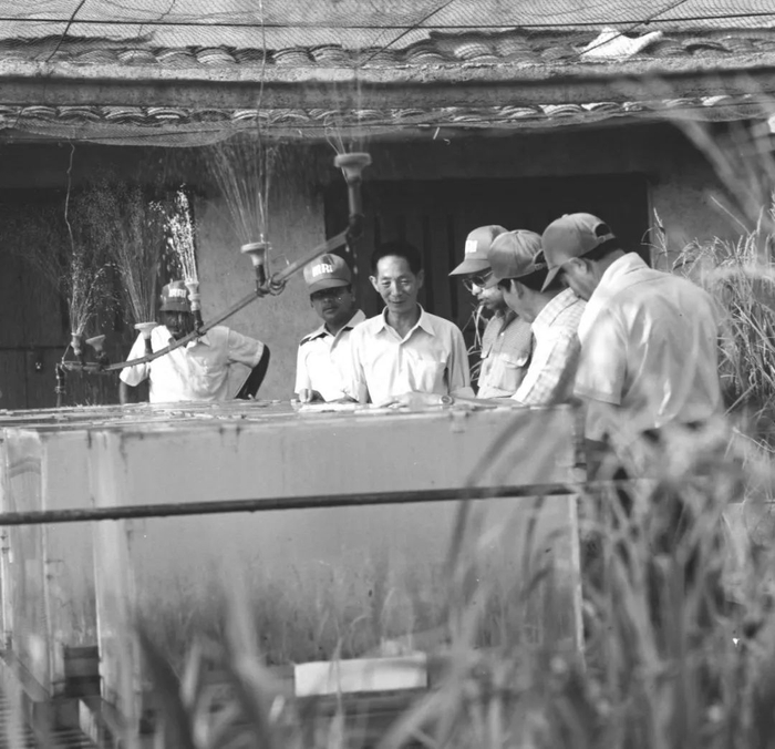 中国杂交水稻育种学家袁隆平(左三)和国际杂交水稻育种培训班学员一起参观湖南省水稻研究所高光效育种技术。新华社记者 王平 摄(1980年10月3日发)