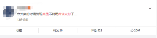 据多名网友表示,在点外卖的时候发现美团不能使用微信支付了。