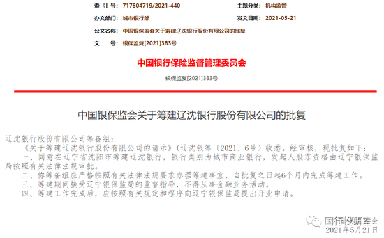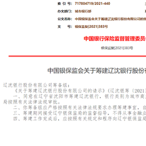 6、2021年5月21日,银保监会正式批复辽沈银行筹建。
