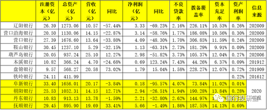 2、阜新银行2020年的营收与净利润同比分别大幅下降3.84%和95.57%,丹东银行2020年的营收与净利润同比分别下滑。59%和32.80%,朝阳银行与抚顺银行的2020年净利润同比分别下降26.51%和1.49%。