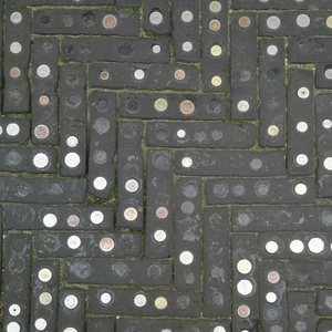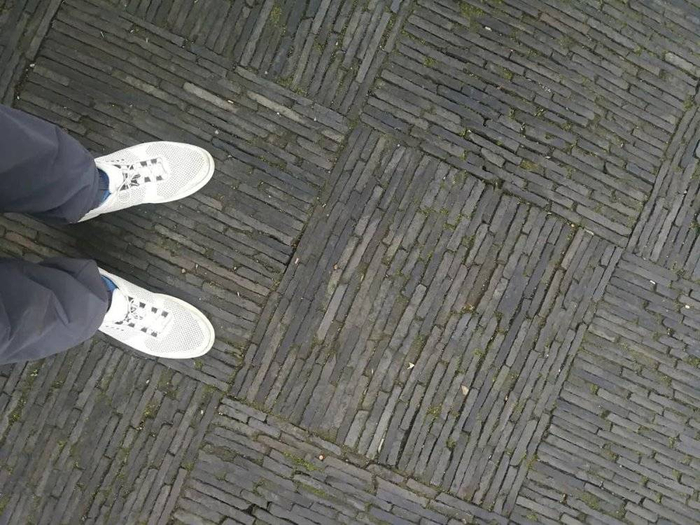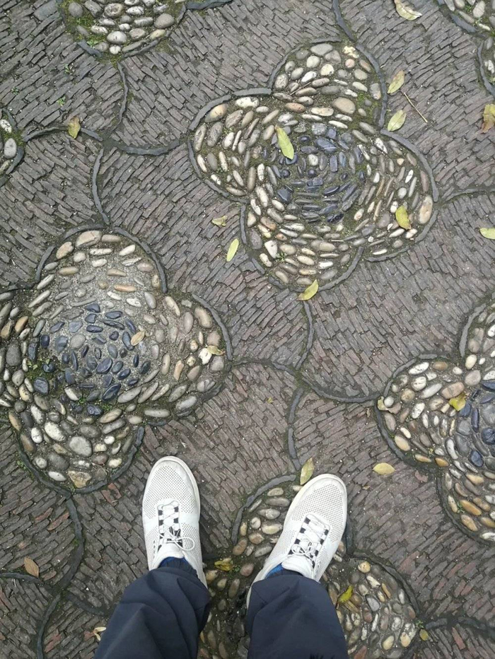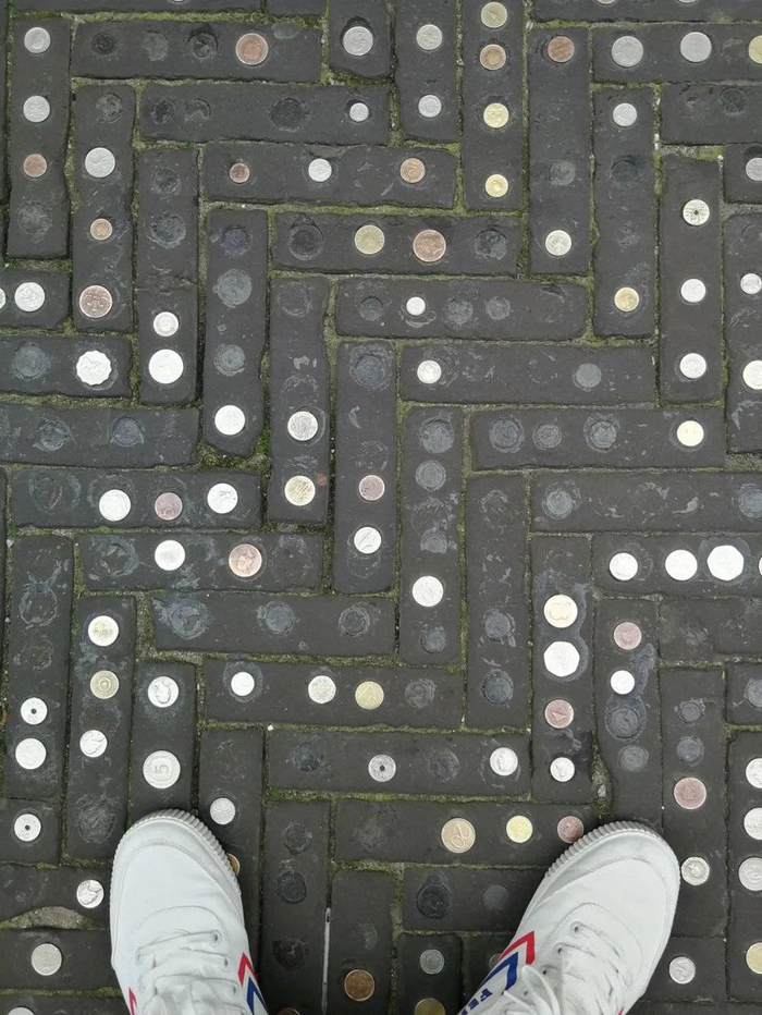 在荷兰海牙时,“飞跃”鞋还很新。以前没见过有人会用真的钱币装饰路面,让我觉得海牙是个有钱的地方。
