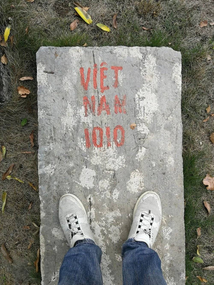 在广西龙州,我去看法国领事馆里清末中法战争后中法勘界遗留下来的界碑。有块石碑,刻有汉文“中国广西界浦门岭”与法文“安南”字样,后用红漆涂改成越南文,刷上“越南1010”字样,大概是越南脱离法国殖民统治后的中越界碑,不知怎么流落到了前法国领事馆院子里。