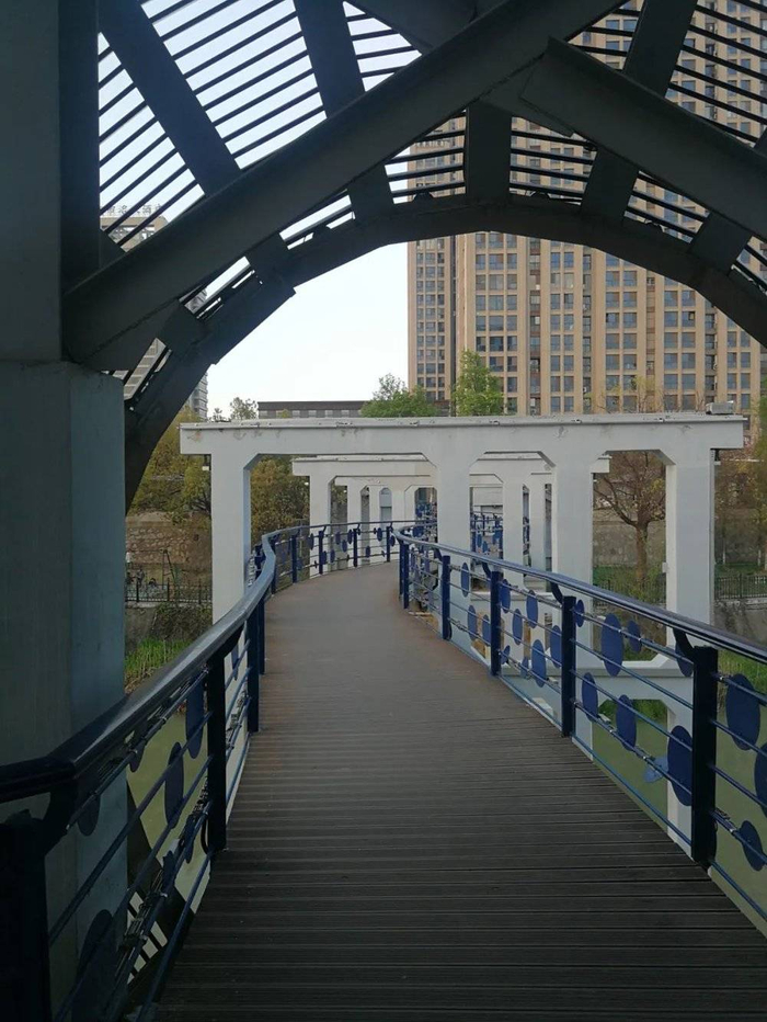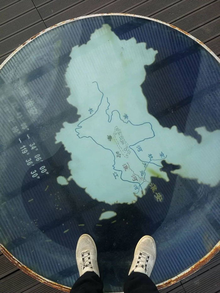 也许因为现在出不了国,各种有形无形的边界线让我异常敏感。在江苏省淮安市,发现地图上有一处“中国南北地理分界线标志园”,打车过去看,是古淮河上的一座步行桥,桥中央有个球形亭子,朝北的一面涂成冷色,朝南的一面涂成暖色,亭子里有个圆盘,画着中国地图,标出中国南北地理界线秦岭、淮河的位置,地图下写着:中国·淮安,北纬32°43'00"~34°06'00",东经118°12'00"~119°36'30"。