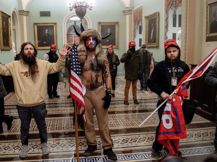 今年1月6日,美国的抗议者冲进国会大厦,在国会大厅里开cosplay派对。极右翼阴谋论组织“QAnon”成员、绰号“Q巫师”的Jake Angeli用油彩涂满脸,头戴维京号角,吸引了大部分人的目光。