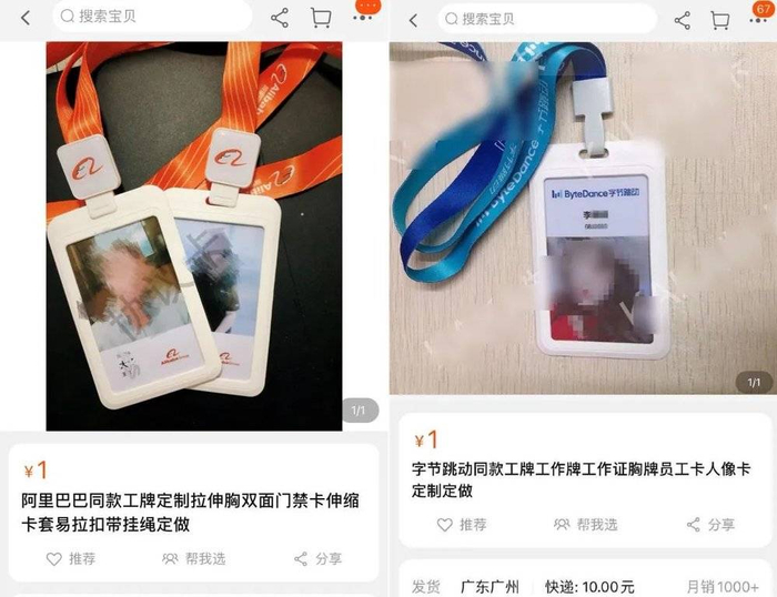 淘宝上阿里巴巴、字节跳动的同款工牌,月销量300+,1000+,一张进不去办公楼的工牌满足了职业生涯的南柯一梦,虽然不包邮。
