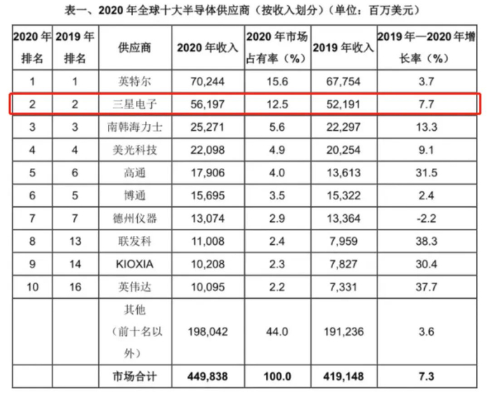 三星作为全球半导体产业的领导企业,不单生产自家的手机芯片,还为另一芯片巨头高通代工。市场研究机构Gartner以半导体供应商2020年收入进行划分,其中排名前十名的企业分别为:英特尔、三星电子、SK海力士、美光、高通、博通、德仪、联发科、铠侠、英伟达。三星电子在2020年市场占有率达12.5%,且进一步缩小与英特尔之间的差距。