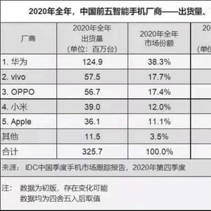 虽然三星手机在中国市场的表现很差劲,但其仍是全球手机市场的“老大”。IDC发布的2020年全年全球手机跟踪报告数据显示,三星在同比下滑9.8%的情况下,仍以2.66亿台的出货量,以及20.6%的市场份额排在第一位。这也是三星连续9年占据第一的位置。