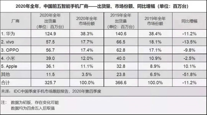 近几年,国内手机市场份额前五名的席位被华为、OPPO、vivo、小米和苹果牢牢掌控着。据IDC中国季度手机市场跟踪报告显示,2019年及2020年,上述五家手机厂商所占市场份额合计分别为93.5%和96.5%。