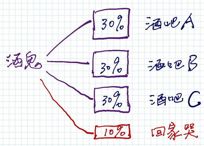 酒鬼去每个酒吧的概率都是30%,这是一个统计结果,也就是说过去100天,酒鬼有30天去酒吧A,30天去酒吧B,30天去酒吧C,10天回家被老婆骂。