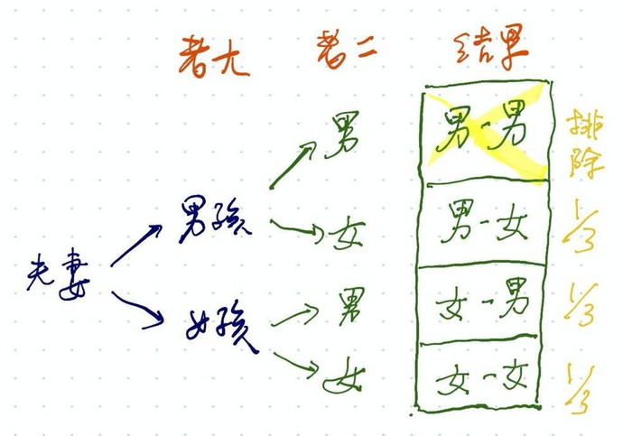 从“结果”推理“原因”,是一个贝叶斯计算。我们不用公式,就可以清晰地推理计算。看见一个女孩,只会发生在“男女、女男、女女”三个样本空间里。