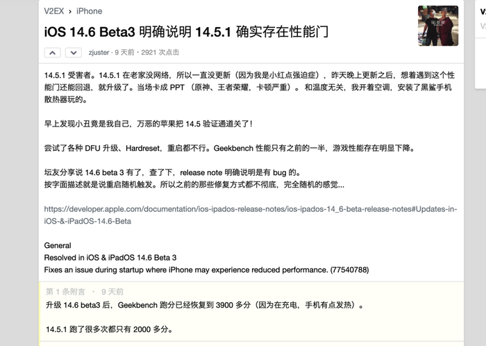 无论是国外的Macrumors论坛,还是国内的V2EX,不少iPhone用户都发现并遇到了iOS 14.5.1的性能bug,且与iPhone型号的新旧无关。