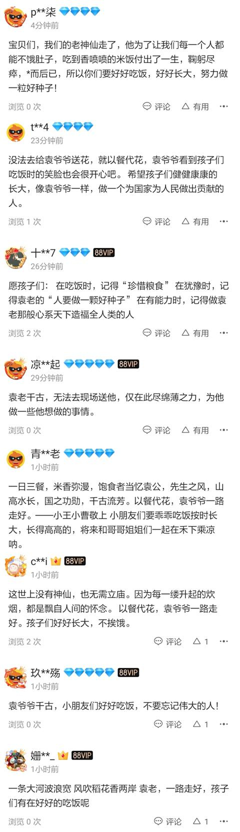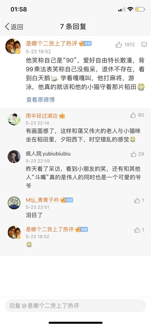 袁隆平逝世后,一位网友在相关新闻评论道:他笑称自己是“90后”,爱好自由特长散漫,背九九乘法表笑称自己没痴呆,退休不存在,看到白天鹅学着嘎嘎叫;他打麻将,游泳,他真的就该和他的小猫守着那片稻田。