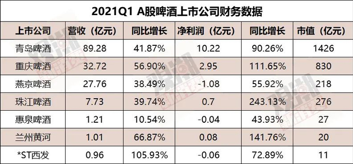 同样的紧迫感也出现在青岛啤酒、重庆啤酒、华润啤酒等诸多啤酒龙头企业身上。签约顶流、IP联名、借助热门综艺等营销方式层出不穷,效果仿佛立竿见影——2021年Q1财报显示,国产啤酒7家上市公司的营收、净利润全部实现两位数以上的双增长。