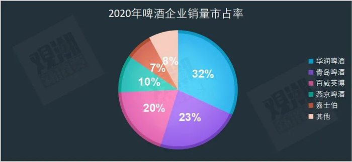 数据显示,如今的啤酒行业CR5约为92%。2020年销量市占率从高到低依次为华润啤酒的31.9%,青岛啤酒的22.9%、百威英博的19.5%、燕京啤酒的10.3%和嘉士伯的7.4%。