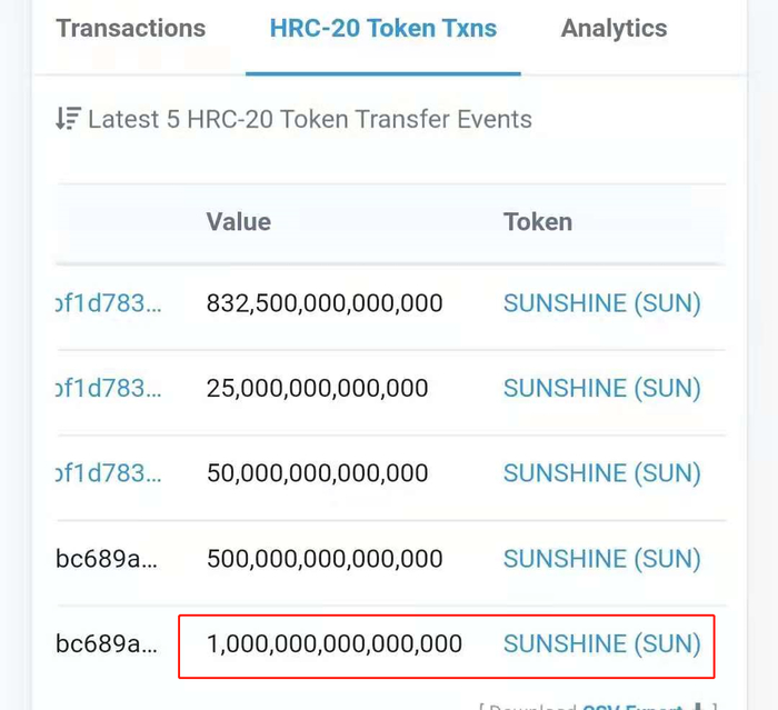复制代币发行交易的哈希值到火币区块链网站上,就能清楚地查到这比 1 千亿的“ 太阳币 ”横空出世。