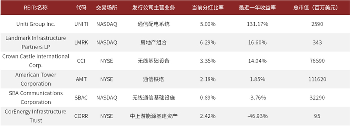 ► 具有良好的分红率: 美国基础设施和仓储物流REITs的平均分红率达到3.5%,高于美国股票分红率和美国十年期国债利率。美国共有6只基础设施REITs,其中CCI、AMT、SBAC主营无线通信业务,UNITI主营通信配电业务,CORR主营中上游能源基站业务,LMRK主营房地产组合的投资经营。6只REITs分红比率差异悬殊,UNITI和LMRK分红比率达到5%及以上,而经营无线通信和能源基站的4只REITs分红比率较低,最低的SBAC仅有0.89%。