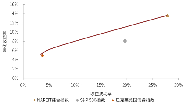 ► 与传统资产相关性较低:美国 REITs和股票、债券、商品的长期相关性系数分别为0.7、-0.1、0.2,可见REITs收益率与标普500指数之间存在较强的相关性,而与巴克莱美国债券指数之间呈弱负相关性、与标普高盛商品指数间呈弱正相关性。因此在资产组合中同时加入REITs、债券和商品,可以起到较好的风险分散效果