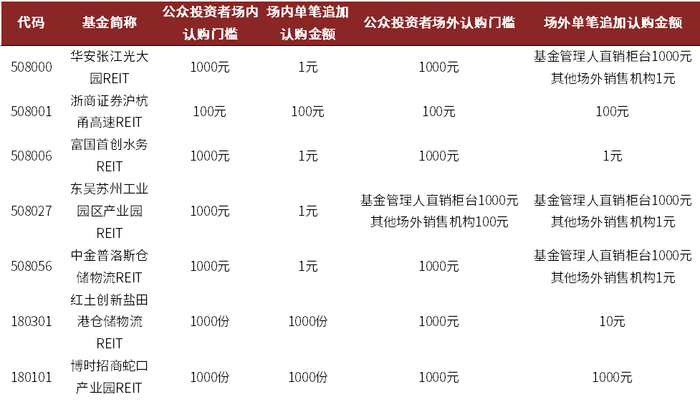 ► 首批基础设施公募REITs也对公众投资者的认购份额设了限制,最低门槛大致在100-1000元之间,追加认购金额在1-1000元之间。总体来看,场内认购以及通过基金管理人直销柜台单笔追加认购金额更高。
