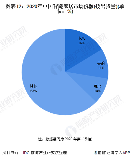 根据IDC的数据显示,2020年,我国智能家居市场出货量排名前三的厂商分别是小米、美的和海尔。其中,小米在2020年第三季度的出货量份额达16%,处于龙头地位;而美的和海尔作为传统家电企业,市场份额的差异不大,分别为11%、10%。