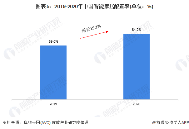 在政策的驱动下,智能家居市场进入发展快车道。据奥维云网(AVC)监测数据显示,2020年,我国智能家居配置率达84.2%,较2019年增长了15.1个百分点,智能家居的市场渗透率进一步提升。