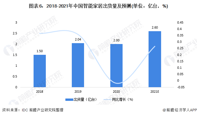 2020年,面对新冠疫情和上游供应紧缺带来的压力,2020年全年中国智能家居设备市场出货量为2亿台,同比下降1.9%;IDC预计,2021年中国智能家居市场将走出阴霾,迎来反弹,预计全年出货量接近2.6亿台,同比增长26.7%。