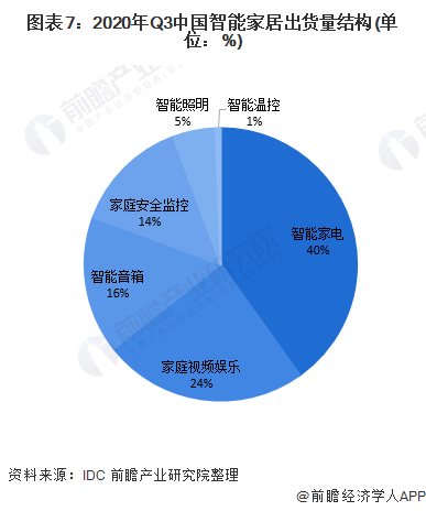 从智能家居设备的细分领域来看,目前市场上智能家电和视频娱乐设备的市场份额最大。以2020年第季度中国智能家居出货量数据为例,智能家电的出货量达2050万台,占整体市场份额的40%;其次是家庭视频娱乐,出货量达1240万台,市场份额为24%。