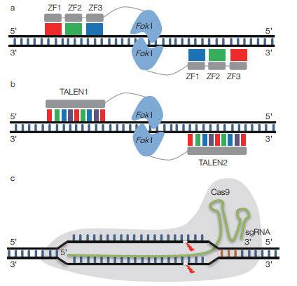 ZFN、TALEN及CRISPR/Cas9基因编辑技术:(a)锌指核酸酶(ZFN)基因编辑技术;(b)TALEN基因编辑技术;(c)CRISPR/Cas9基因编辑技术
