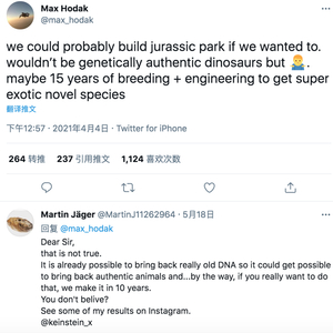 同日,马克斯·霍达克又解释称,此恐龙非彼恐龙,而是将恐龙基因融合至现有物种中,创造一个“新物种”,随后即遭到评论质疑。