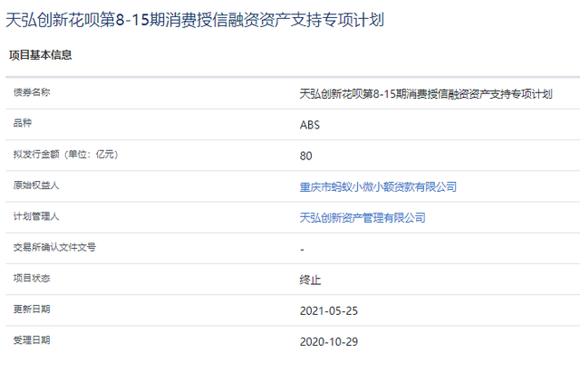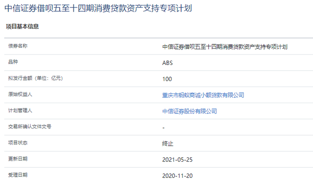 5月25日讯,上交所公司债券项目信息平台显示,重庆市蚂蚁小微小额贷款有限公司80亿元ABS和重庆市蚂蚁商诚小额贷款有限公司100亿元ABS项目状态均显示为“终止”。