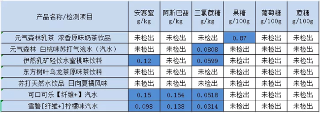湖州市安吉县市场监管局食药检测中心在市场买了无糖可乐、无糖雪碧、元气森林乳茶、元气森林气泡水、东方树叶乌龙茶、农夫山泉苏打水、伊然乳矿轻饮7款大众爱喝的无糖饮料、苏打水饮料,进行了实验室检测。