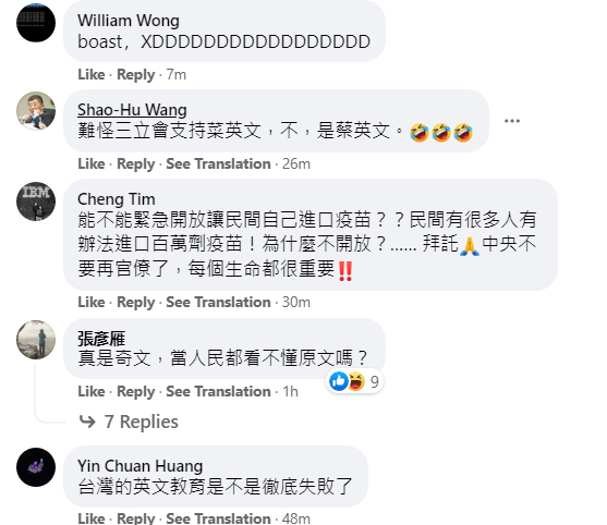 不过,即使是三立新闻那段不完整的截图,很多台湾网民还是看到了那个“吹嘘”(boast)的单词,大家在评论区纷纷嘲笑三立新闻丧事喜办到颠倒黑白,更有人调侃他们这波操作是“英语教育彻底失败”、“菜英文”。