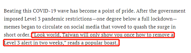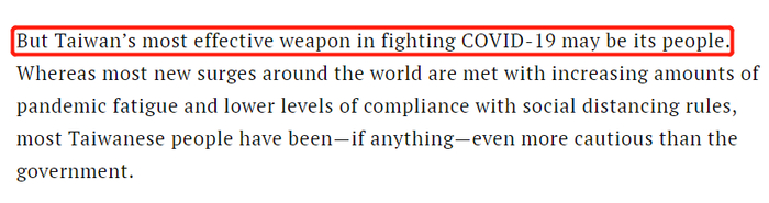 大概是为了照顾“友军”的情绪,尽管是在评论台湾疫情的失控,但作者在措辞上比较委婉,还在文章结尾补充了一句“台湾最有效的抗疫武器,就是台湾的居民”。但明眼人都能看出来,这话充其量就是比较高情商的“台湾加油”罢了。