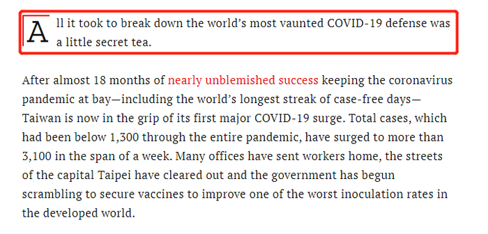 谁知道,就在这一周时间里,岛内确诊人数以每天数百个新增不断飙升。就在这句“狠话”越发看着像笑话时,台湾亲绿媒体三立新闻居然找到一个非常刁钻的角度,硬是把台湾疫情给夸了一把。