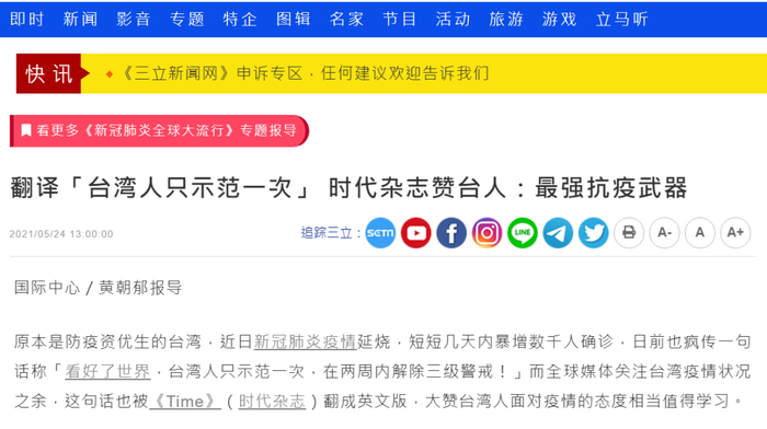 24日,三立新闻发表了一篇报道,把上面那篇委婉的批评,说成是 “《时代》杂志赞台人”,还提到了那句“只示范一次”的翻译,说这是在“大赞台湾人面对疫情的态度相当值得学习”。