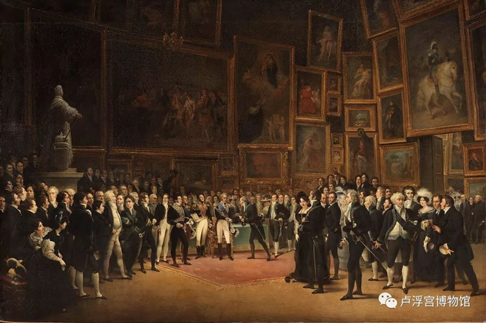 《查尔斯十世向卢浮宫1824年沙龙参展艺术家颁奖》这幅画的作者是弗朗索瓦·约瑟夫·海姆,场景记录了当时查尔斯十世颁奖给雕刻家卡特里耶的时刻。当时的卢浮宫一楼沙龙里汇集了当时众多艺术大家,这个官方的艺术典礼唤起了沙龙的重要性和国家在艺术中起到的重要作用。