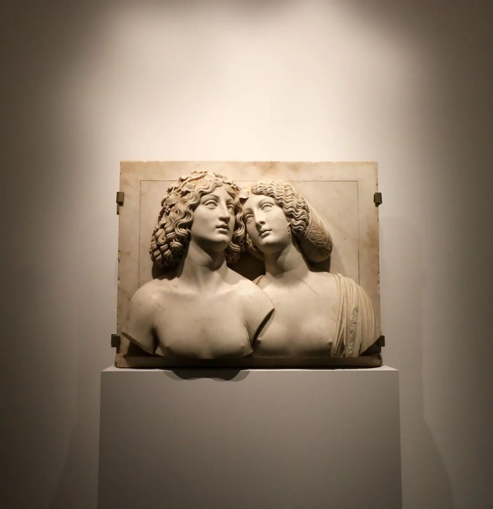 图里奥·隆巴尔多(Tullio Lombardo)刻画了两尊极具美感的浮雕胸像,只见巴克斯与阿丽亚娜两人的头温柔地向彼此倾斜,身体朝向正前方,他们疏离的、上移的目光仿佛在诉说着对不可触及之物的无尽渴望。艺术家对头发光滑柔软的刻画,更加突出了脸部的光亮。一明一暗的对比,着重凸显人物的内心世界。这类浮雕通常出现在贵族、收藏家与研究者的住所中。