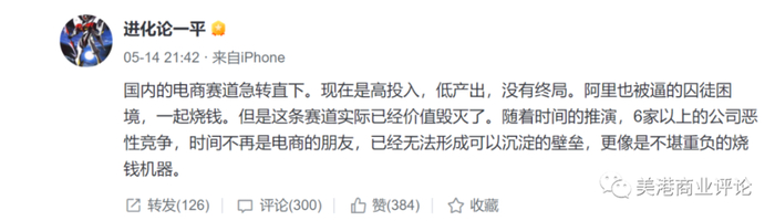 这个话题,最早源于雪球一位私募基金经理的一段话,内容是谈及当前国内的电商竞争格局,越来越激烈,从行业到公司,都无法做时间的朋友。详细如下图: