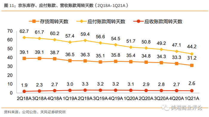 和阿里拼多多比,京东并不算真正的平台级公司,因为自营权重仍然很高。和另外两家比,把京东比作线上的沃尔玛更为贴切。也就是中国线上最大的超市。商超,考察的主要是搬运商品的效率。京东的库存周转天数、应付账款周转天数,过去十二个季度,都在持续转好。刚过去的2012年Q1,京东的库存周转天数只需31.2天!