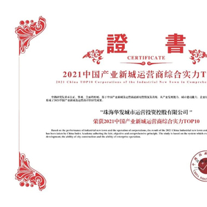 2021年5月21日,由中国房地产TOP10研究组主办、中指控股(CIH)、中指研究院承办的“2021中国房地产上市公司研究成果发布会暨第十九届产城融合投融资大会”在北京隆重举行。会议发布了2021年中国产业新城运营商研究最新成果,凭借稳健的经营业绩及扎实的综合实力,珠海华发城市运营投资控股有限公司(以下简称“华发城市运营”)荣获“2021中国产业新城运营商综合实力TOP10”,自2017年起连续五年稳居全国产业新城运营商第一阵营。