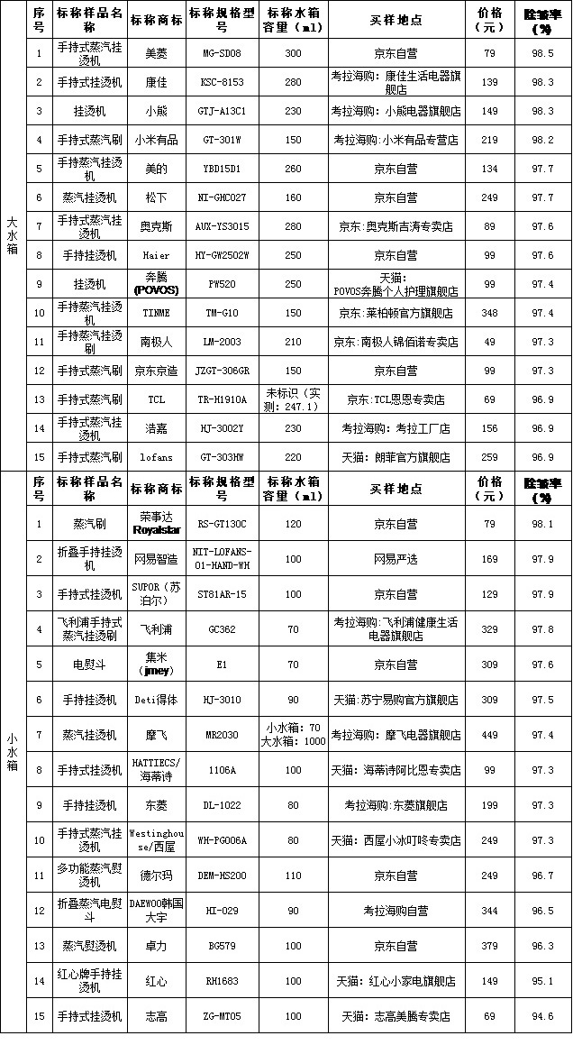 一般情况下,水箱大小决定了可使用时间的长短,但也会受到挂烫机蒸汽大小等因素的影响。为此,试验人员在购买样本时即选定了70-150ml的小水箱挂烫机和150-300ml的大水箱挂烫机各15款,分别进行对比。