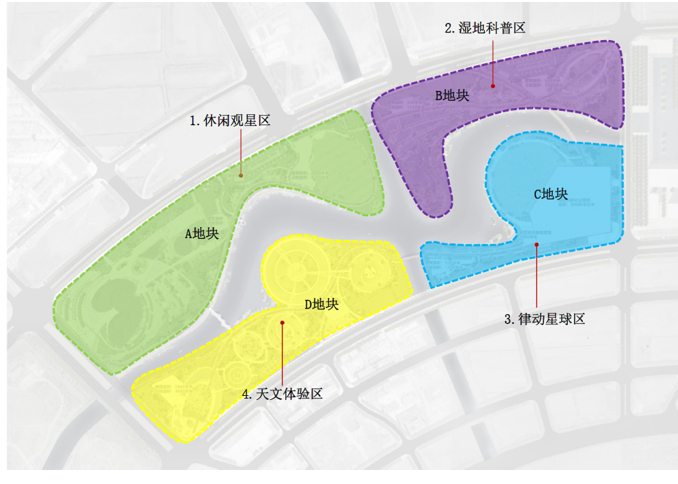 其中,休闲观星区占地约10万平方米,以露营观星活动为主。结合滨水空间、疏林草地,可开展营地露营、星空剧院、草坪演唱会、草坪婚礼、户外展览等活动,“星毯”和“星光宝盒”即是该区域的两大特色建筑。