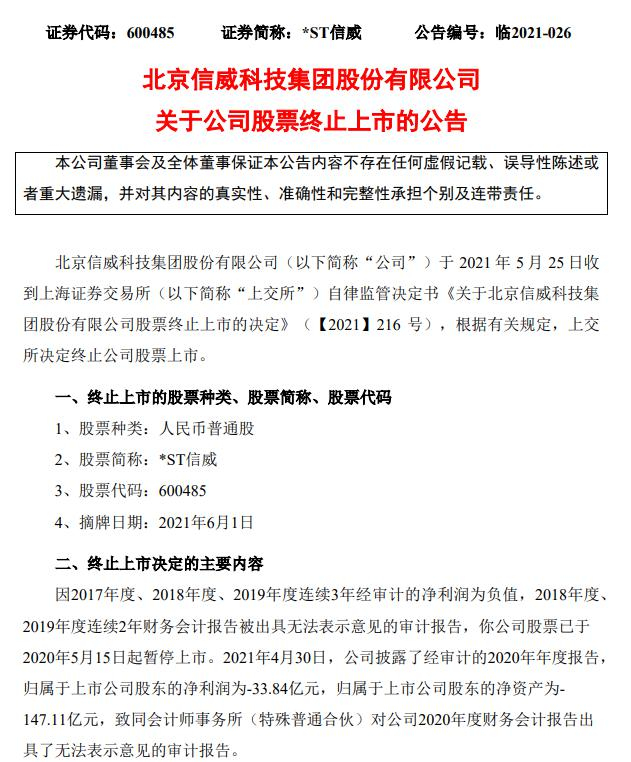 *ST信威公告,收到上交所自律监管决定书,根据有关规定,上交所决定终止公司股票上市,摘牌日期为2021年6月1日。公司股票终止上市后,将转入全国中小企业股份转让系统进行股份转让。