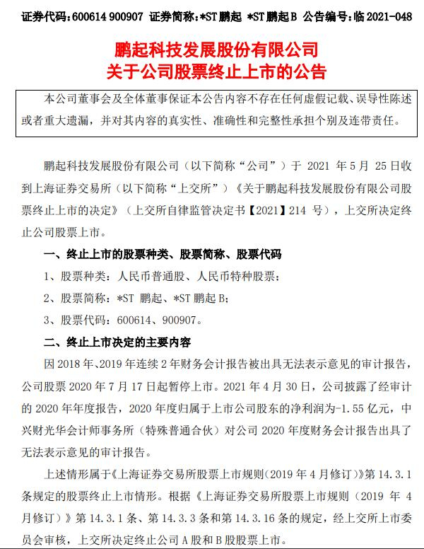 *ST鹏起晚间公告,上交所决定终止公司股票上市。公司股票进入退市整理期交易的起始日为2021年6月2日,退市整理期为30个交易日。如不考虑全天停牌因素,预计最后交易日期为2021年7月14日,如证券交易日期出现调整,公司退市整理期最后交易日期随之顺延。公司股票在退市整理期内全天停牌的,停牌期间不计入退市整理期,预计的最后交易日期将顺延。全天停牌天数累计不超过五个交易日。
