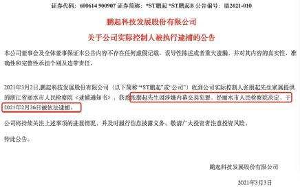 3月2日晚间,*ST鹏起公告称,收到公司实控人张朋起家属提供的浙江省丽水市人民检察院《逮捕通知书》,获悉张朋起因涉嫌内幕交易犯罪,经丽水市人民检察院决定,于2021年2月26日被依法逮捕。