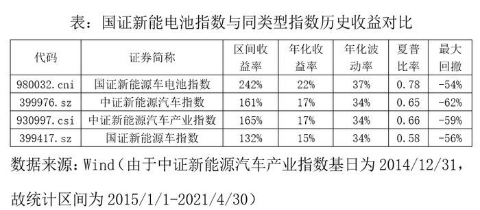 另一方面,在与新能源车同类型指数对比后发现,国证新能电池指数历史表现也领先其他同类型指数。自2015年至2021年4月30日,国证新能电池指数累计收益率为242%,年化收益率22%,夏普比率高达0.78,领先其他同类新能源车指数。