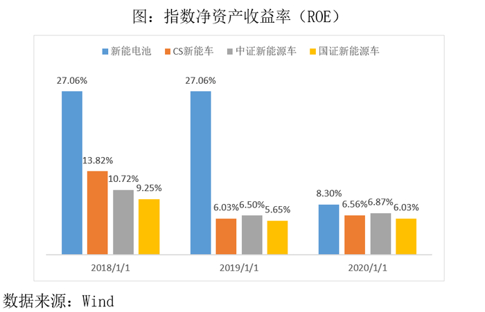 从盈利能力来看,国证新能电池指数的盈利能力远远好于其他同类指数。2018-2020年间,国证新能电池指数净资产收益率(ROE)复合增速高达20.47%,显著高于CS新能车指数(8.75%)、中证新能源车指数(8.02%)、与国证新能源车指数(6.96%)。