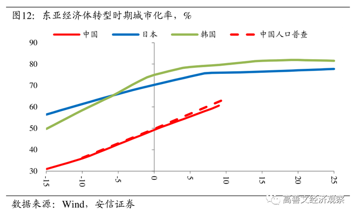 尽管中国和日韩在转型时期的收入水平、产业结构、人均用电量等指标十分相近,但似乎城市化数据存在较大差异。重要的原因在于城市化率这一指标在定义和计算上存在诸多困难,比如中国的户籍制度以及统计技术上的困难。再比如由于计划生育政策的影响,中国老龄化程度显著高于其他东亚经济体,老年人难以实现城市化,而且老年人实现城市化本身从经济增长的角度来讲,意义也十分有限。