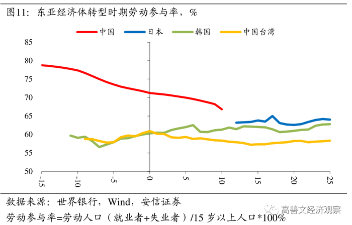 在低迷的生育率和加速的老龄化背景下,如图10所示,东亚经济体劳动年龄人口(15-64岁)占比在经济转型后均出现了见顶回落的态势,这也意味着抚养比开始触底回升。