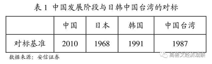 为了更好地预测我国经济中长期走势,我们在此前的研究中曾将中国的转型时期与历史上日本、韩国、中国台湾等东亚经济体进行了对标。通过观察人均GDP和二、三产业占比等指标,我们确立了各东亚经济体转型的对标年份。如表1所示,即中国2010年的经济发展程度、人均收入和生活水平大致接近于日本1968年前后的水平、韩国1991年前后的水平、中国台湾1987年前后的水平。