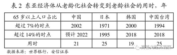 根据联合国定义的老龄化社会(65岁以上人口占比超过7%)和老龄社会(同一占比超过14%),东亚经济体完成这一转变的用时约在20-25年左右,远高于美国(69年)和英国(45年)等发达经济体。